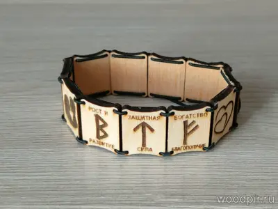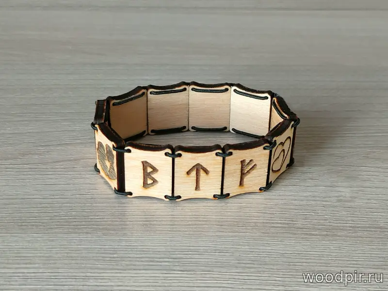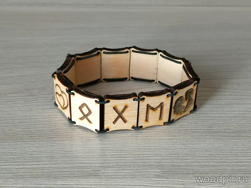 Браслет из дерева с гравировкой рун символизирующих гармонию в отношениях, семейные традиции, единство и доверие в отношениях с близкими, а также защиту и материальное благополучие.