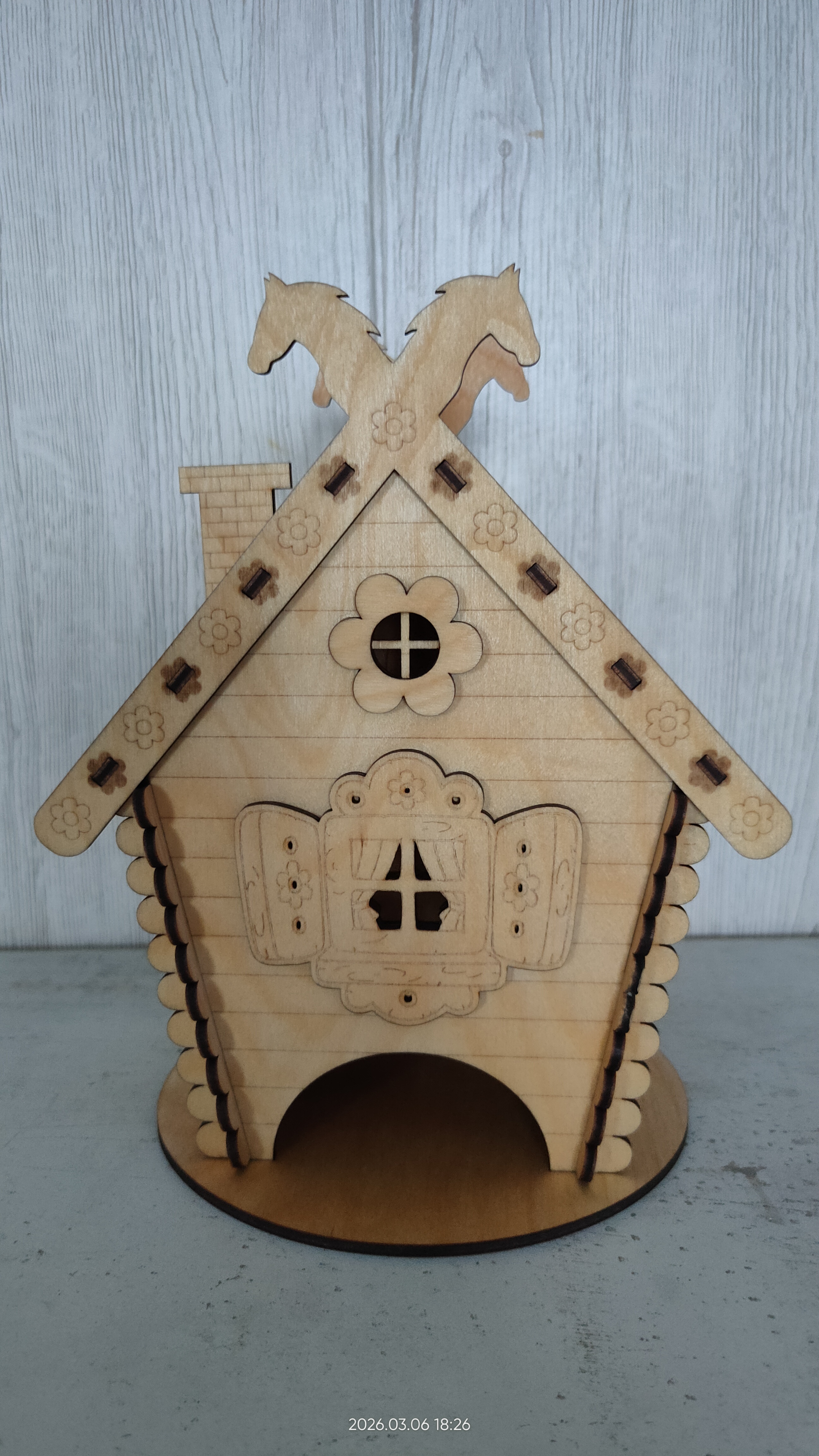 Дизайн: сказочный облик избушки с декоративными элементами — резные узоры, цветочные мотивы, изящные детали на крыше и фасаде.